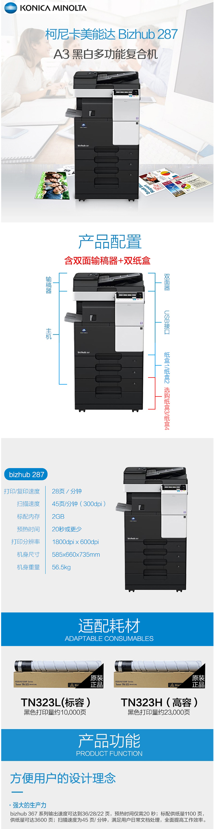 • 商品名称:柯尼卡美能达 Bizhub 287 A3黑白复合机 一体机 (含双面输稿器+双纸盒) 黑白色(单位:台)