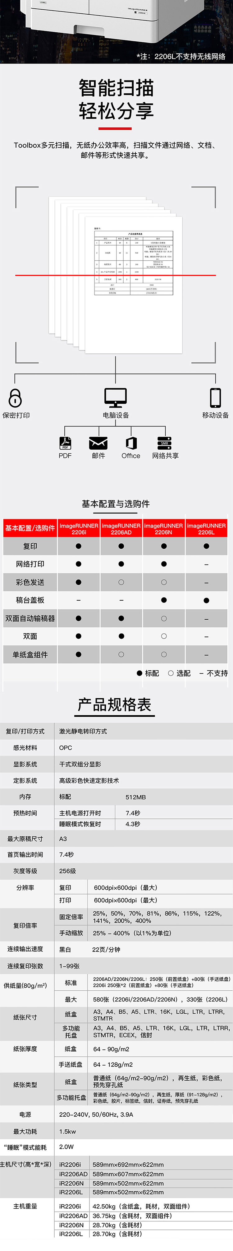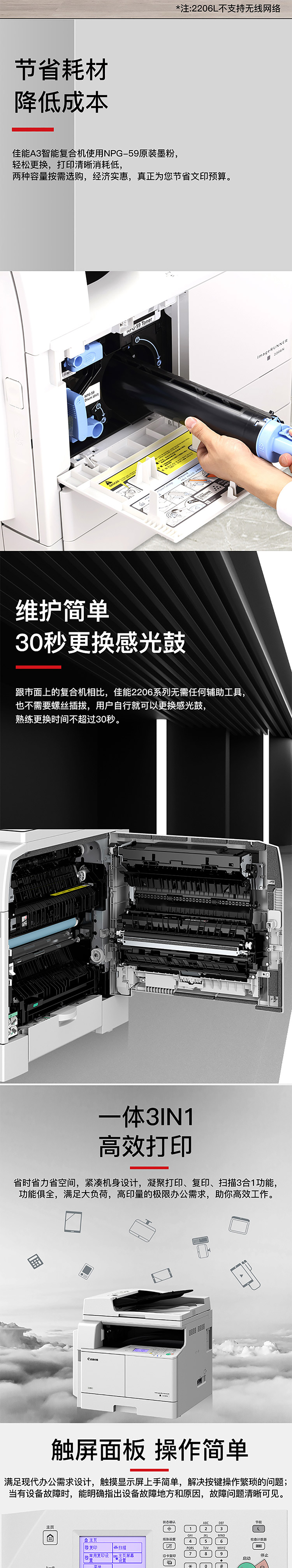 • 商品名称:佳能(CANON)iR2206i A3黑白激光数码复合机一体机(含输稿器、双纸盒)计价单位:台