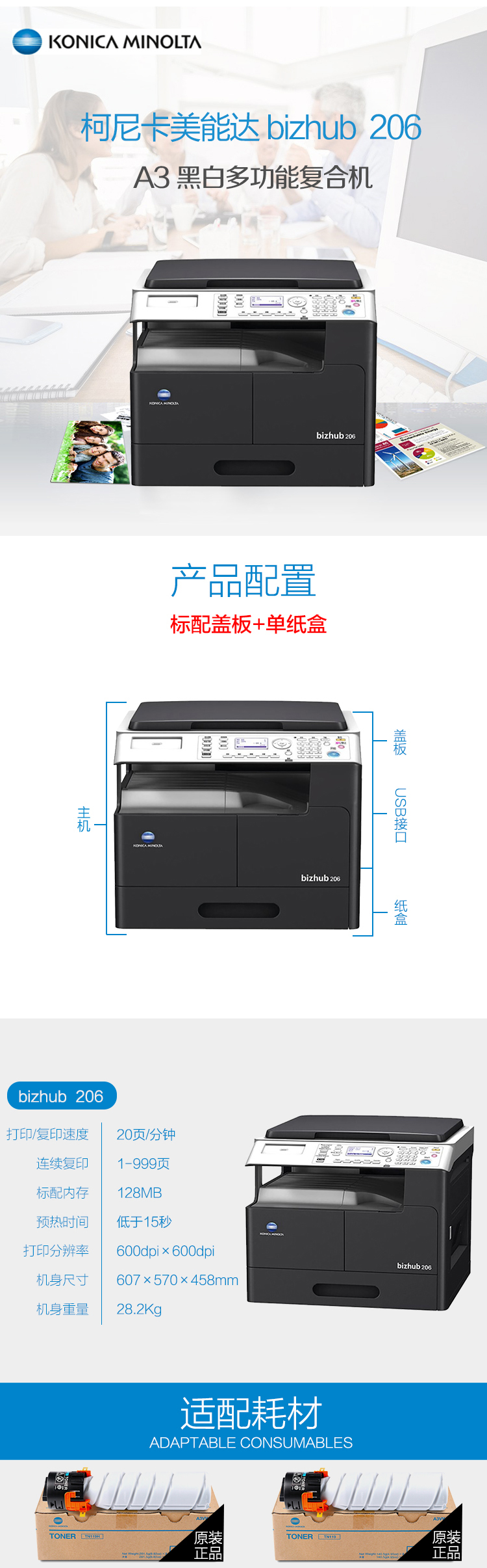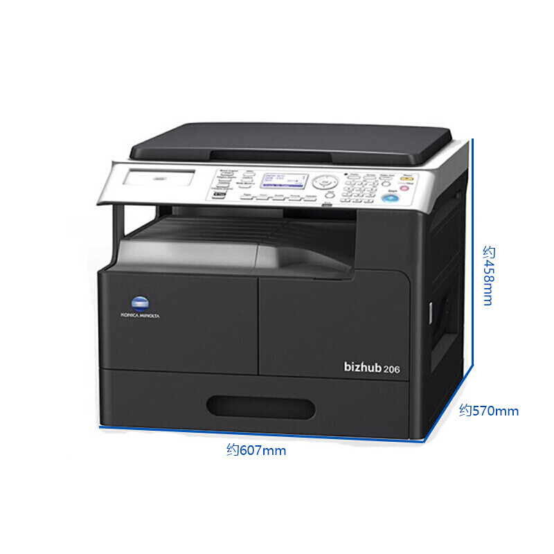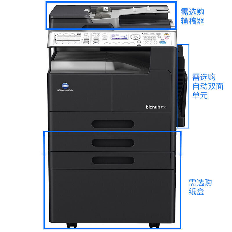 • 商品名称:柯尼卡美能达 bizhub 206 A3黑白多功能复合机 一体机(标配盖板+单纸盒)黑色(单位:台)