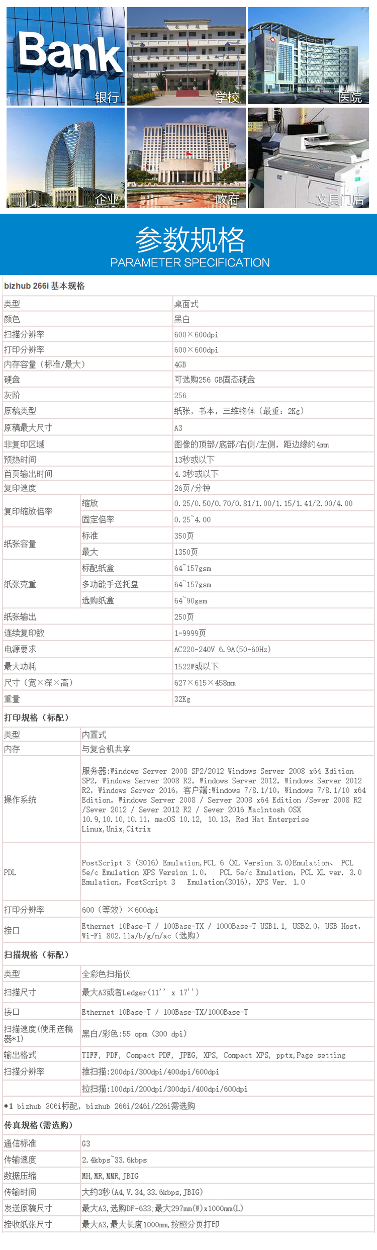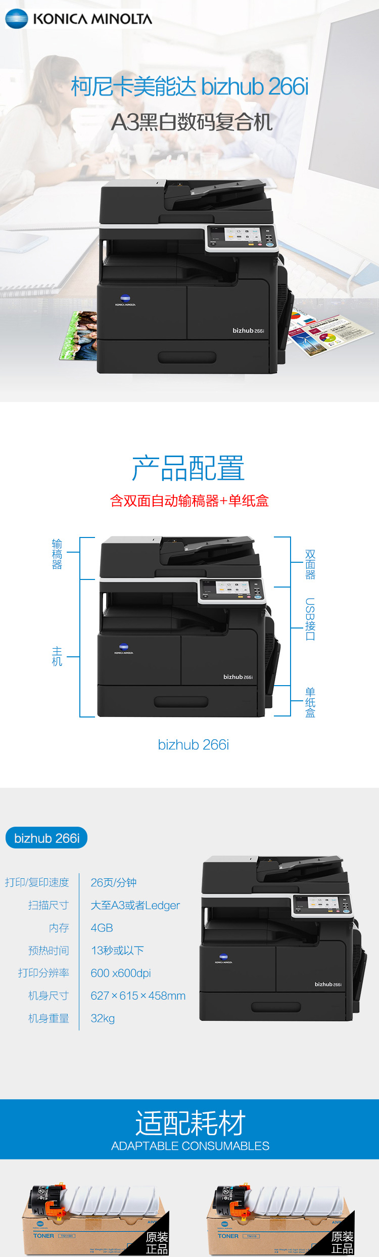 办公设备  > 打印/复印设备  > 复合机/一体机  >  柯尼卡美能达/KONICA MINOLTA  >  柯尼卡美能达 bizhub266i A3黑白复合机一体机(含双面自动输稿器+单纸盒)黑色(单位:台)