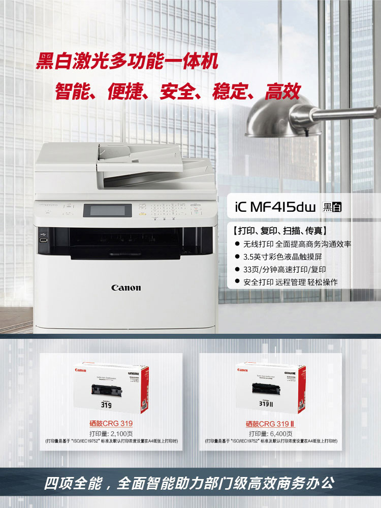 办公设备  > 打印/复印设备  > 复合机/一体机  >  佳能/Canon  >  佳能 CANON MF415DW(自动双面打印/250页/黑白激光)多功能一体机