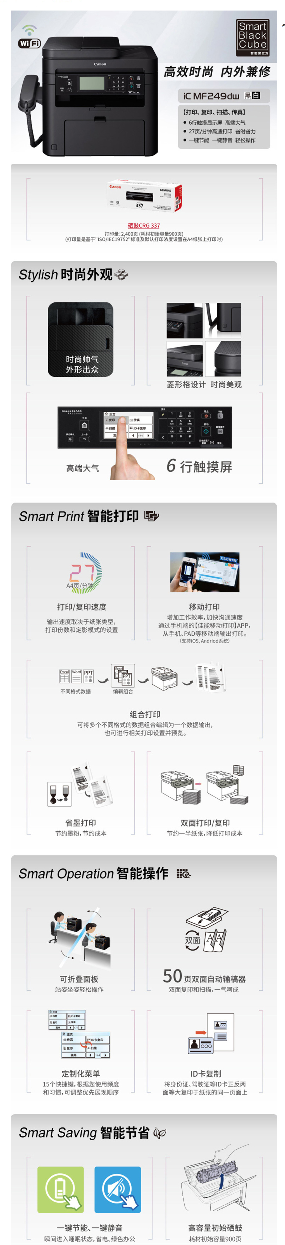 • 商品名称:佳能 CANON MF249DW(自动双面打印/250页/黑白激光)多功能一体机