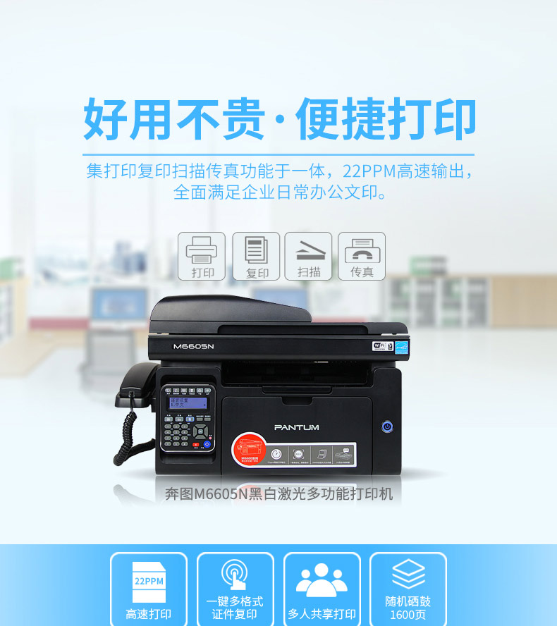 • 商品名称:奔图 PANTUM M6605N(手动双面打印/150页/黑白激光)多功能一体机
