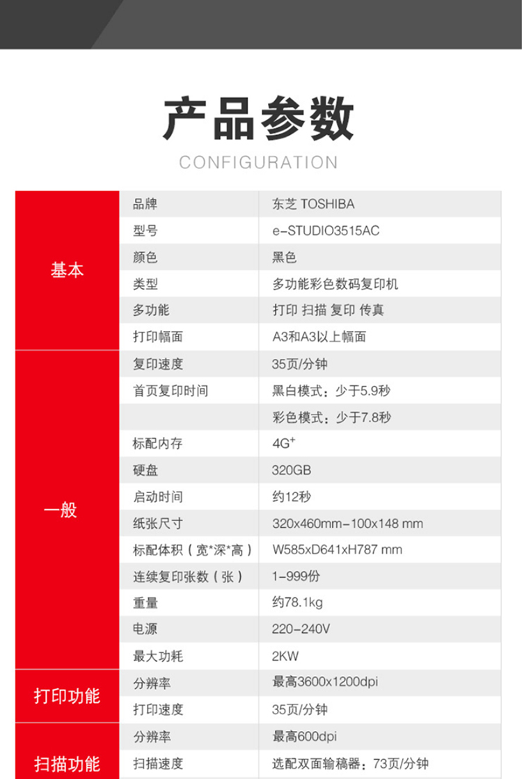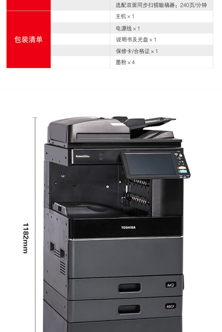 • 商品名称:东芝(TOSHIBA) FC-3515AC A3多功能数码复合机多功能一体机 (主机+自动输稿器+工作台) 黑色(单位:台)