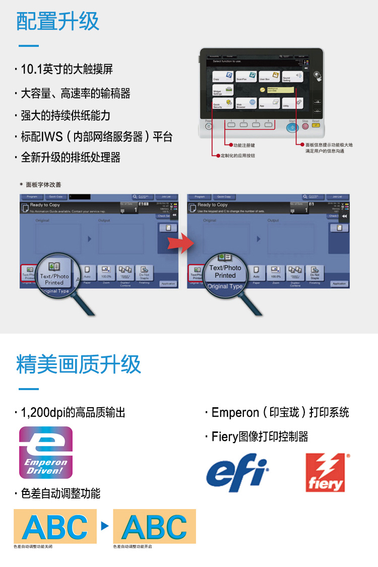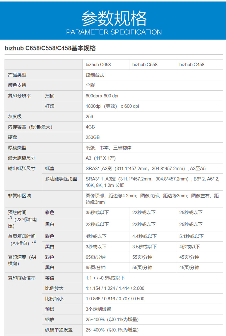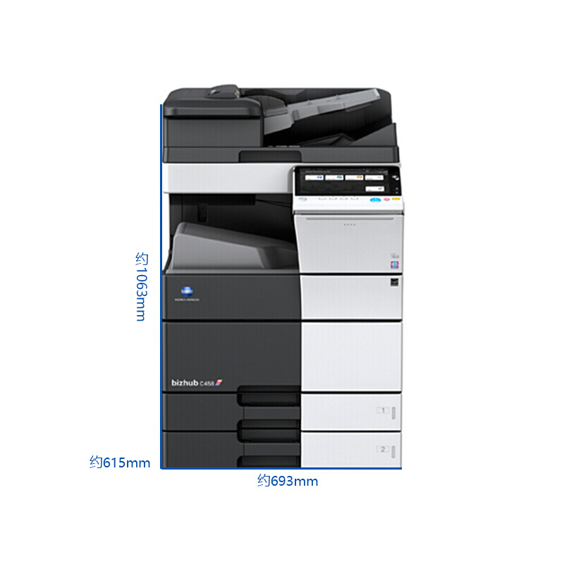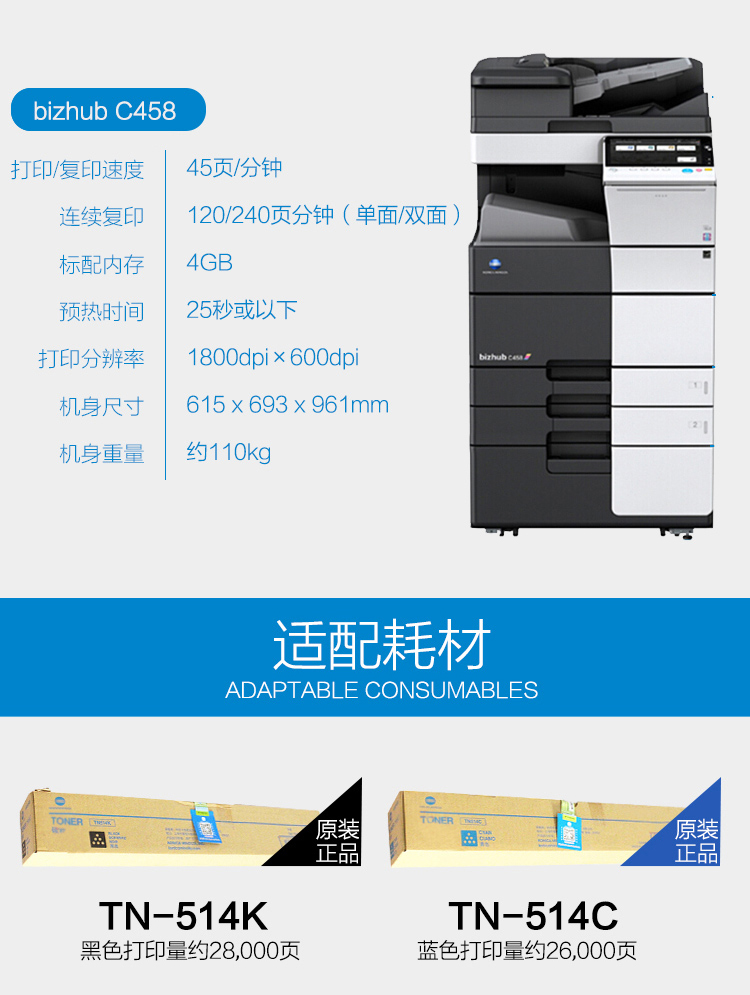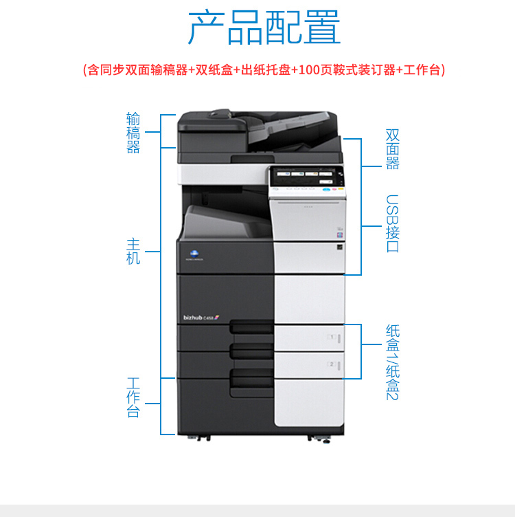 • 商品名称:柯尼卡美能达 bizhub c458 A3彩色数码复合机(双面自动输稿器+双面打印器+双纸盒+原装工作台,加配鞍式装订器+打孔单元)(单位:台)