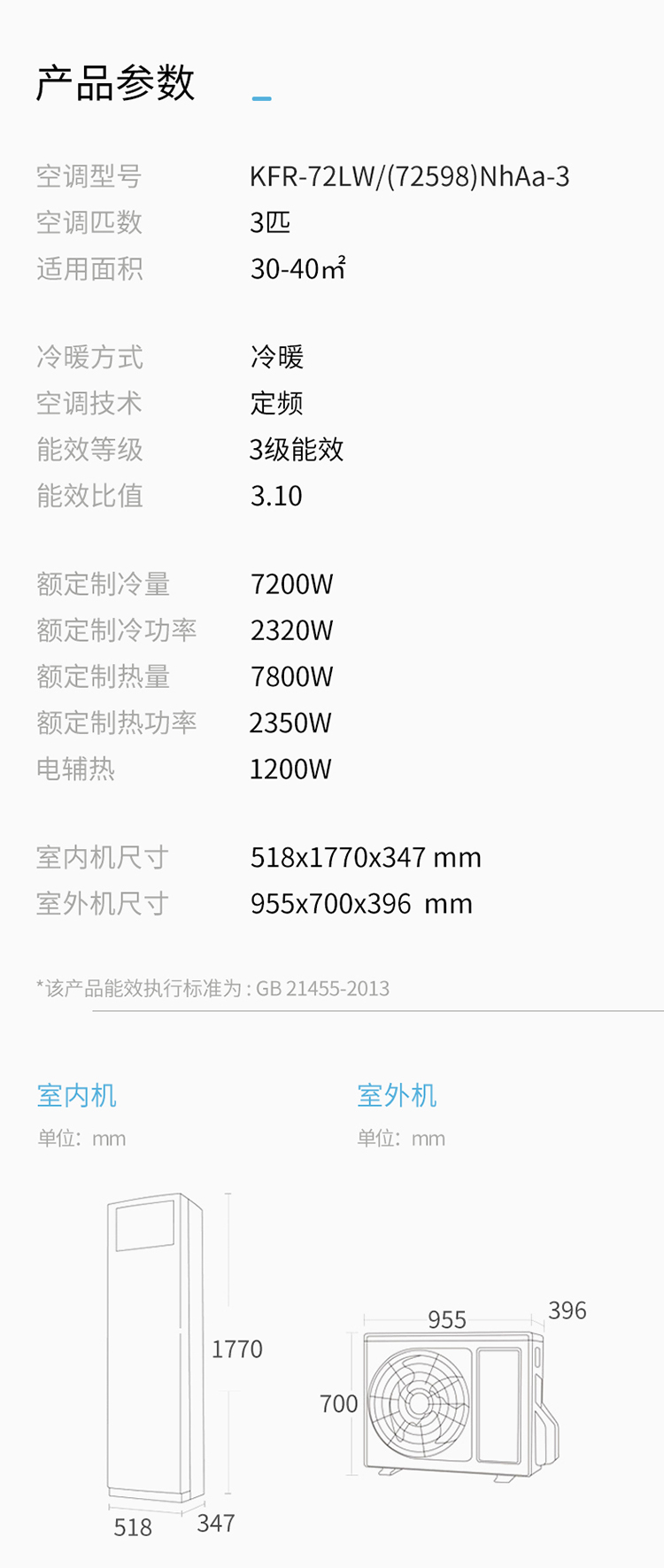 • 商品名称:格力 KFR-72LW/(72598)NhAa-3 3匹柜机定频冷暖柜机空调悦风二代 白色(单位:台)
