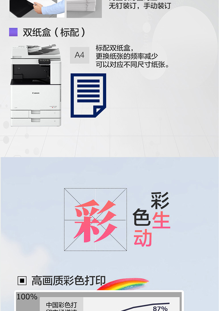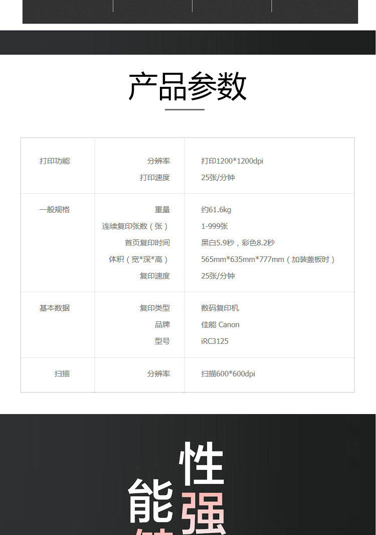 • 商品名称:佳能 iRC3125 A3彩色数码复合机多功能一体机 (配双面自动输稿器+工作台+双纸盒) 白色(单位:台)