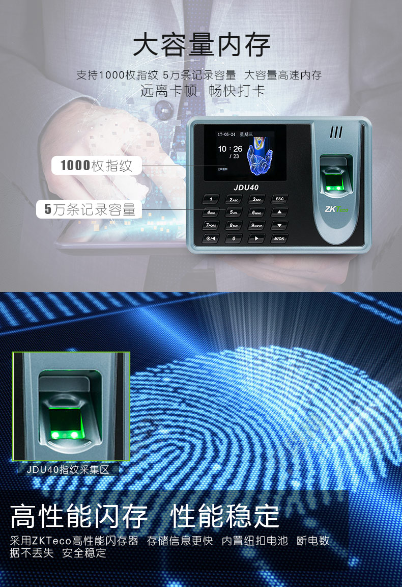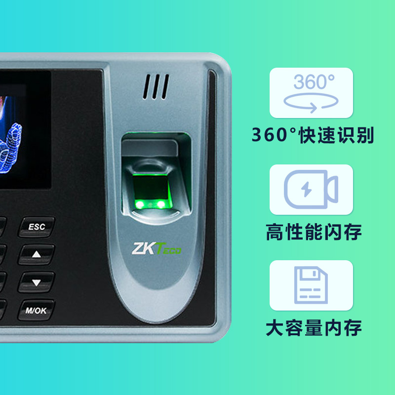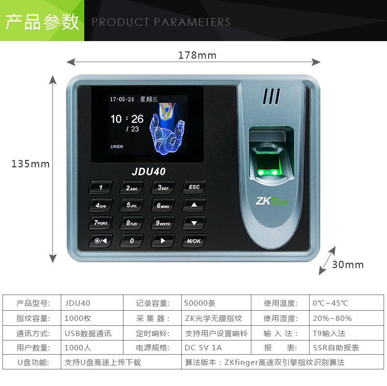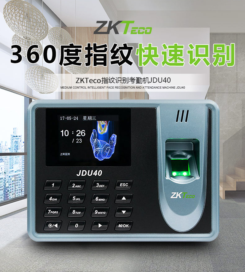 商品名称: 中控智慧 ZKTECO JDU40 彩屏免软件指纹识别考勤机打卡签到器