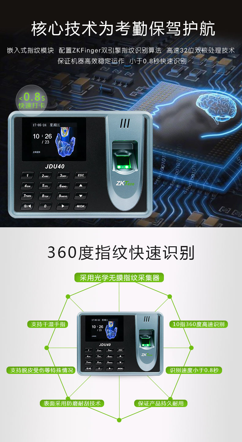中控智慧 ZKTECO JDU40 彩屏免软件指纹识别考勤机打卡签到器