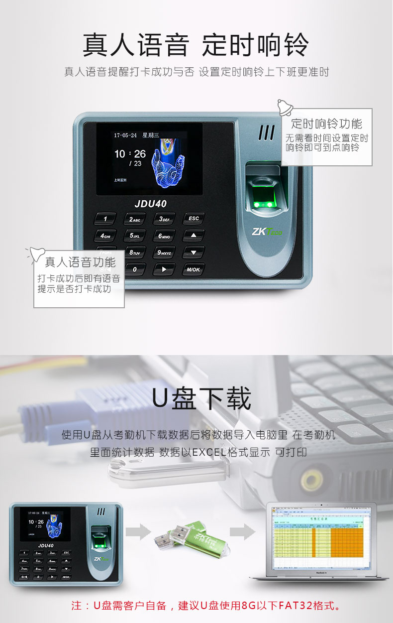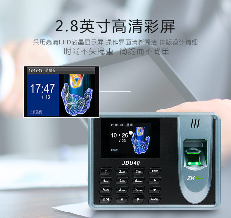 办公设备  > 扫描设备  > 考勤机  >  中控智慧/ZKTECO  >  中控智慧 ZKTECO JDU40 彩屏免软件指纹识别考勤机打卡签到器