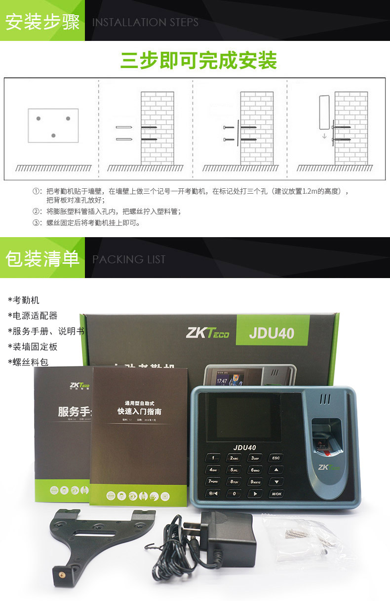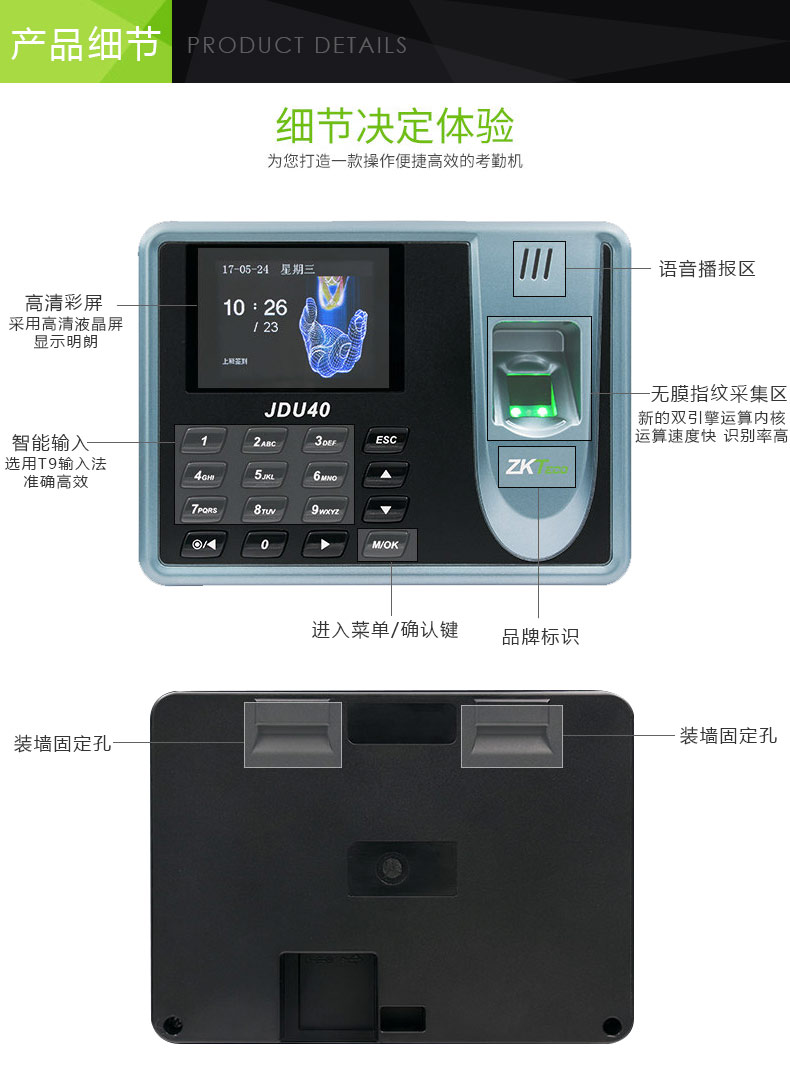 • 商品名称:中控智慧 ZKTECO JDU40 彩屏免软件指纹识别考勤机打卡签到器