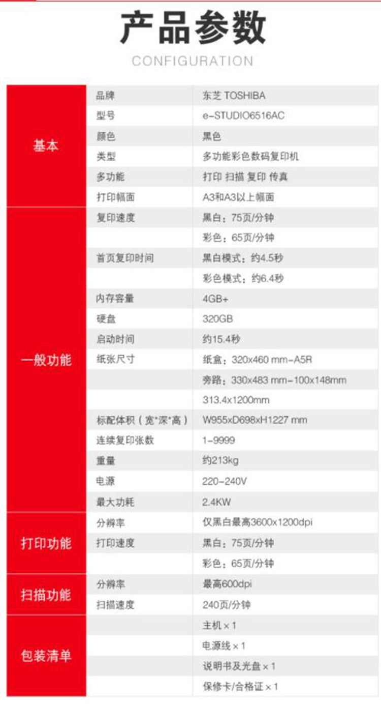 商品名称: 东芝 E-6516AC A3彩色激光高速复印机 (主机+双面器+双面同步输稿器+四个纸盒)(单位:台)