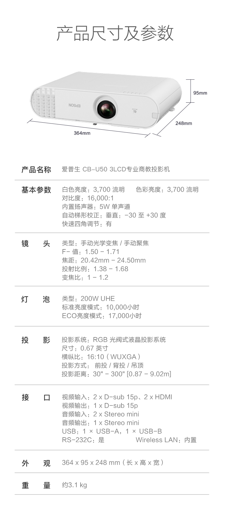 • 商品名称:爱普生(EPSON)CB-U50 3LCD商教投影机 投影仪 3700流明/WUXGA/内置无线投影(单位:台)