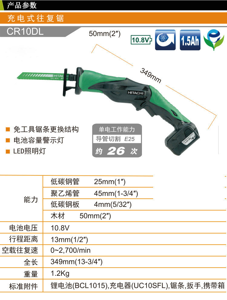 商品名称: 高壹工机(HiKOKI) CR10DL-CPZ 日立10.8V 充电式往复锯 (1.5Ah单电) 配色(单位:套)