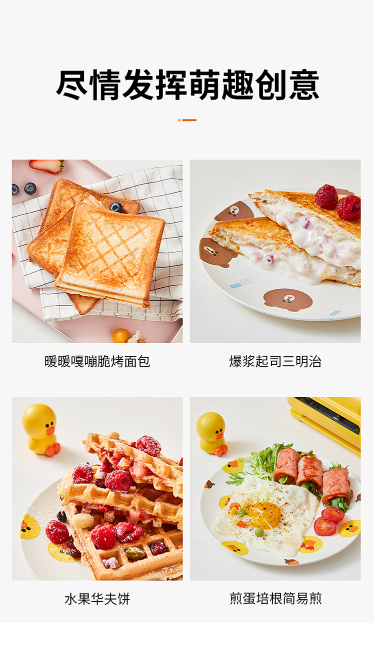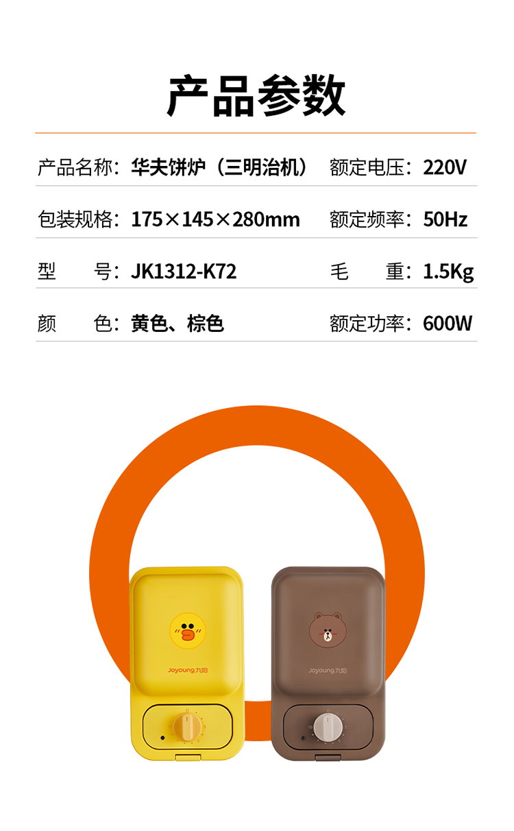 • 商品名称:九阳 JK1312-K72 多功能早餐机华夫饼机 元气莎莉鸡 黄色(单位:台)