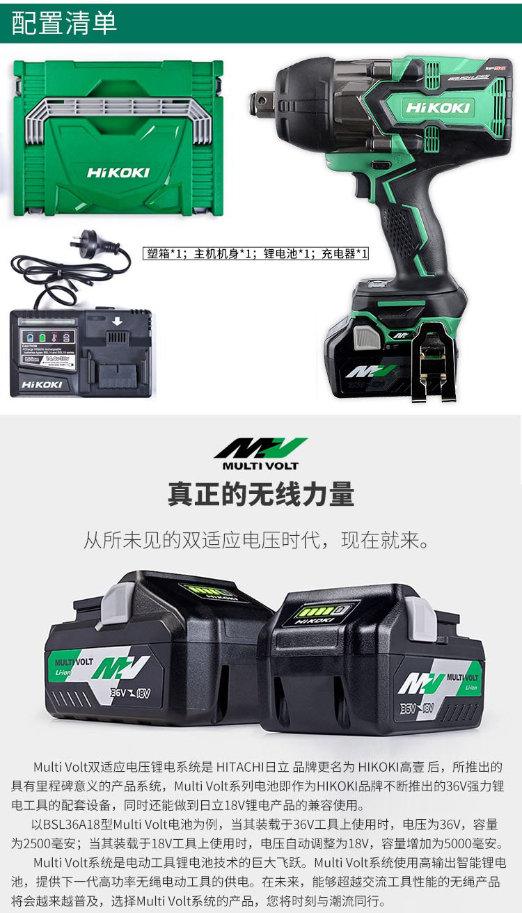 商品名称: 高壹工机(HiKOKI) WR36DA-1MA 3/4"充电冲击扳手套装 36V(一电一充) 配色(单位:把)