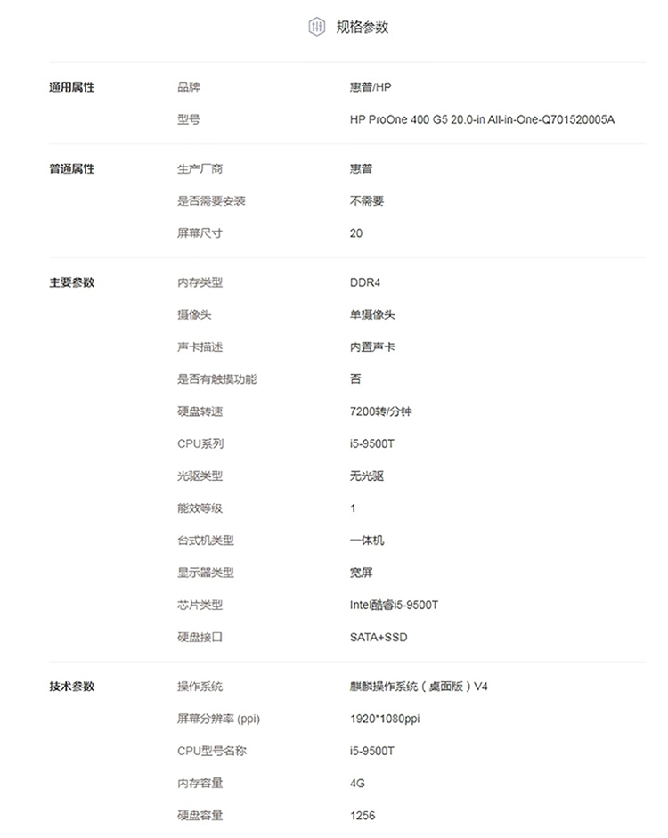 商品名称: 惠普 ProOne 400 G5 20.0-in All-in-One-Q701520005A 一体机电脑 ProOne 400 G5 20寸一体机/New Core i5-9500T(2.2G/9M/6核)/4G DDR4 2400/1T(SATA)+256G(SSD)/无光驱/麒麟操作系统(桌面版)V4/USB键鼠/摄像头/20寸宽屏/三年保修/集显/无线网卡/ 单位:台