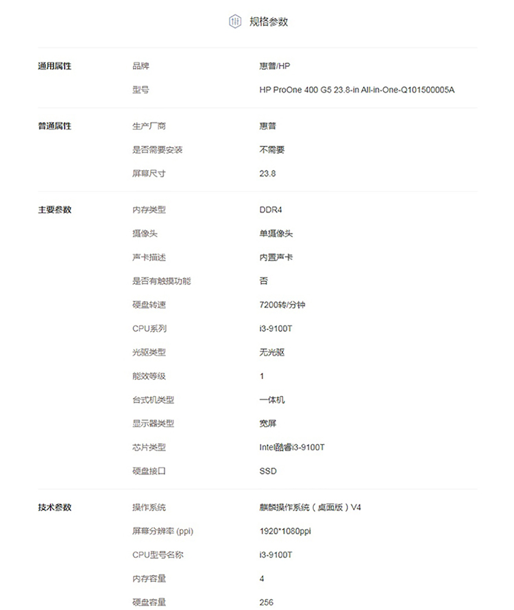 商品名称: 惠普 ProOne 400 G5 23.8-in All-in-One-Q101500005A 一体机电脑 ProOne 400 G5 23.8寸一体机/New Core i3-9100T(3.1G/6M/4核)/4G DDR4 2400/256G(SSD)/无光驱/麒麟操作系统(桌面版)V4/USB键鼠/摄像头/23.8寸宽屏/三年保修/集显/无线网卡/ 单位:台