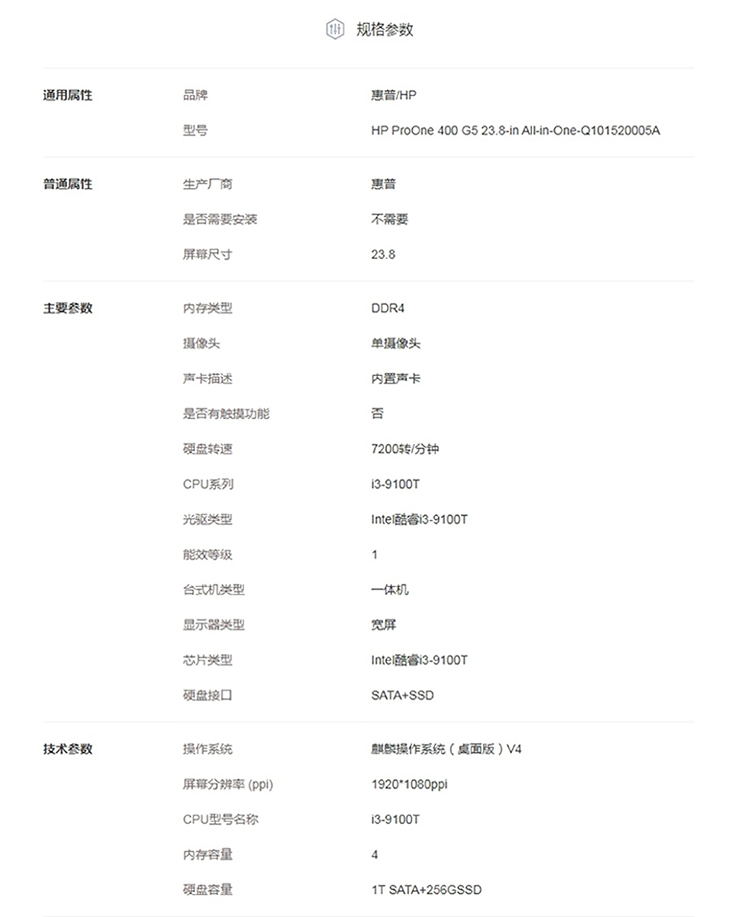 商品名称: 惠普 ProOne 400 G5 23.8-in All-in-One-Q101520005A 一体机电脑 ProOne 400 G5 23.8寸一体机/New Core i3-9100T(3.1G/6M/4核)/4G DDR4 2400/1T(SATA)+256G(SSD)/无光驱/麒麟操作系统(桌面版)V4/USB键鼠/摄像头/23.8寸宽屏/三年保修/集显/无线网卡/ 单位:台