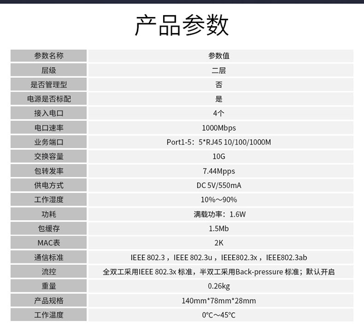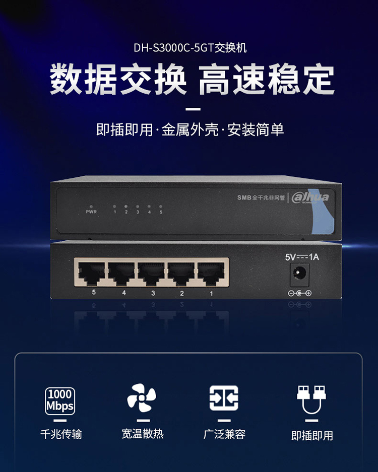 • 商品名称:大华(dahua)5口全千兆交换机 DH-S3000C-5GT 5口交换机 单位:个