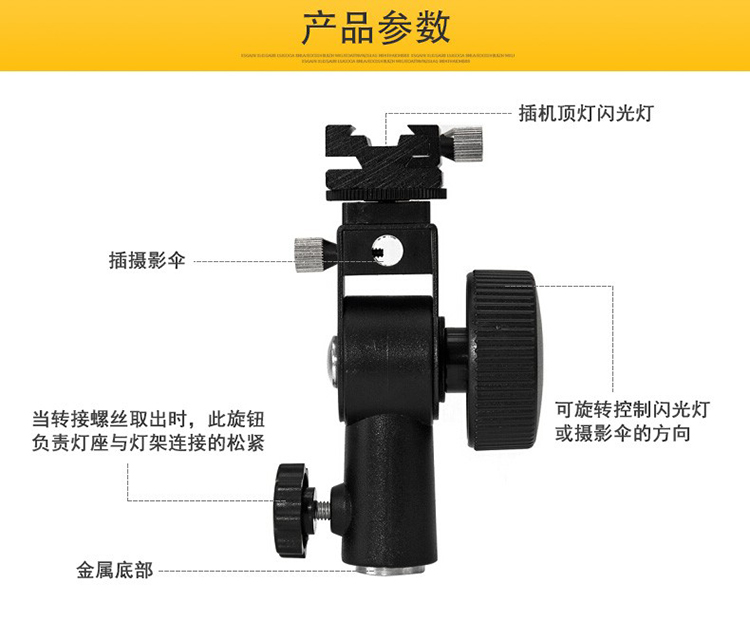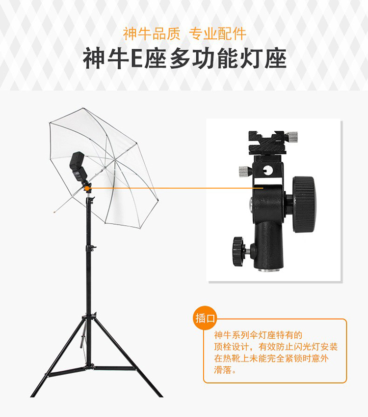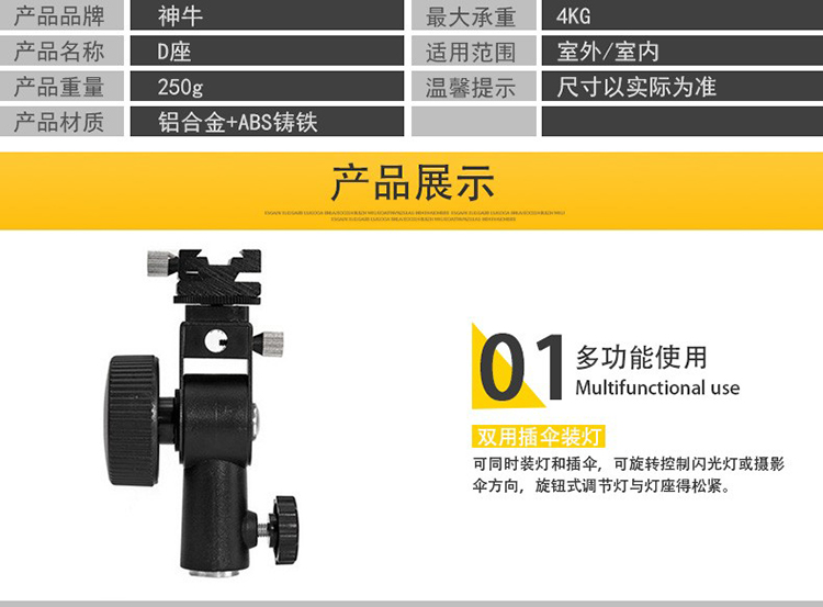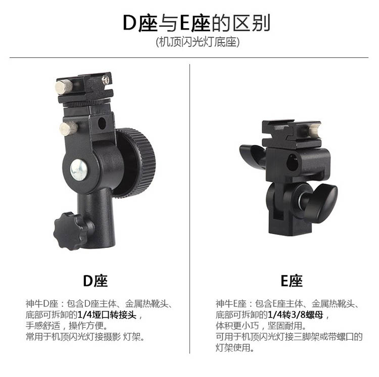• 商品名称:神牛 热靴机顶闪光灯D型灯座 机顶灯底座通用 可装反光伞/柔光伞灯架配件 单位:个
