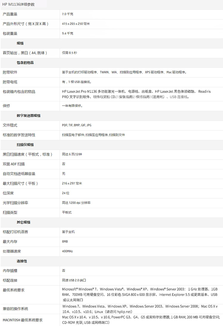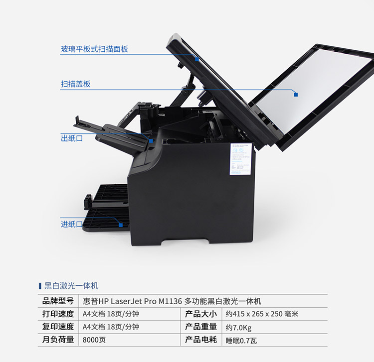 • 商品名称:惠普 M1136 打印机一体机黑白激光多功能家用办公三合一A4 (单位:台)
