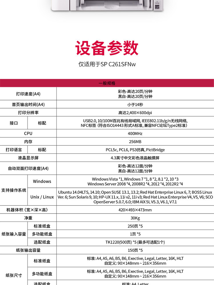 • 商品名称:理光 RICOH SP C261SFNW A4彩色激光多功能一体机