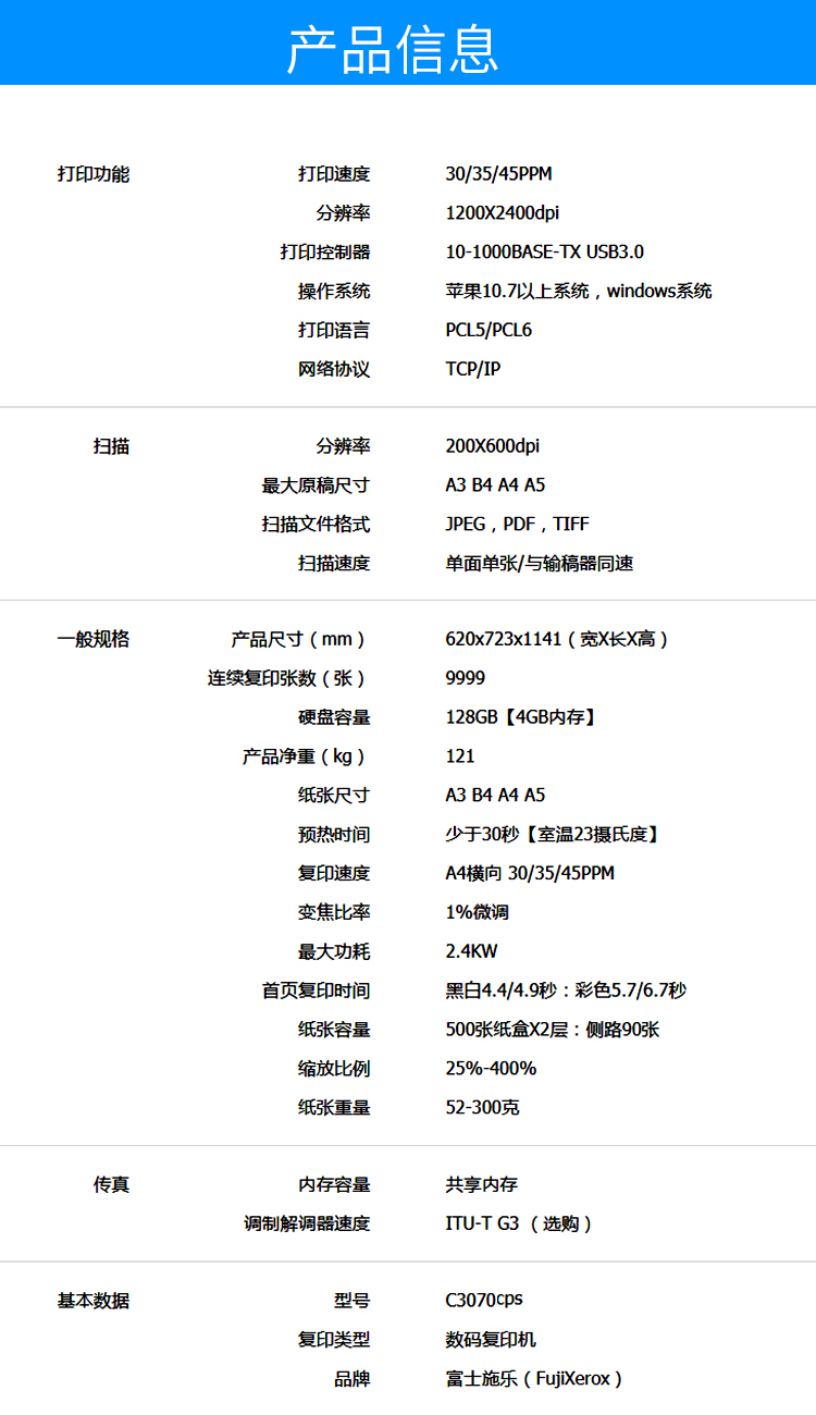 • 商品名称:富士施乐 AP C3070cps 彩色数码复合机多功能一体机 (主机+纸盒组件+C3型小册子装订器) 白色(单位:台)