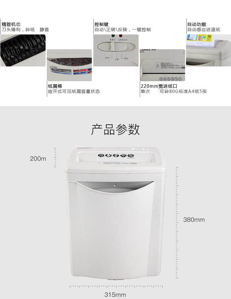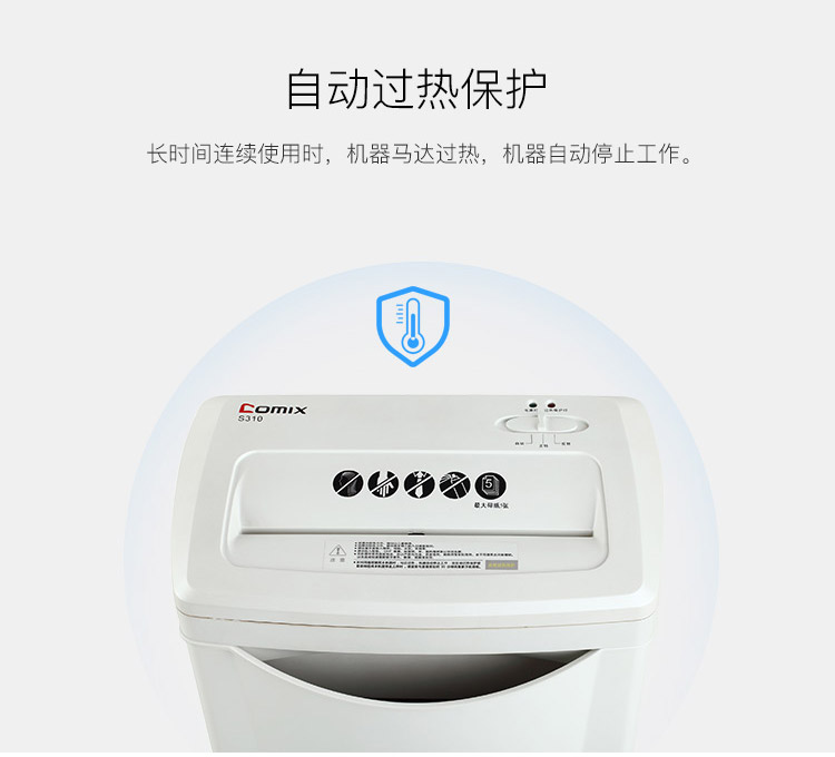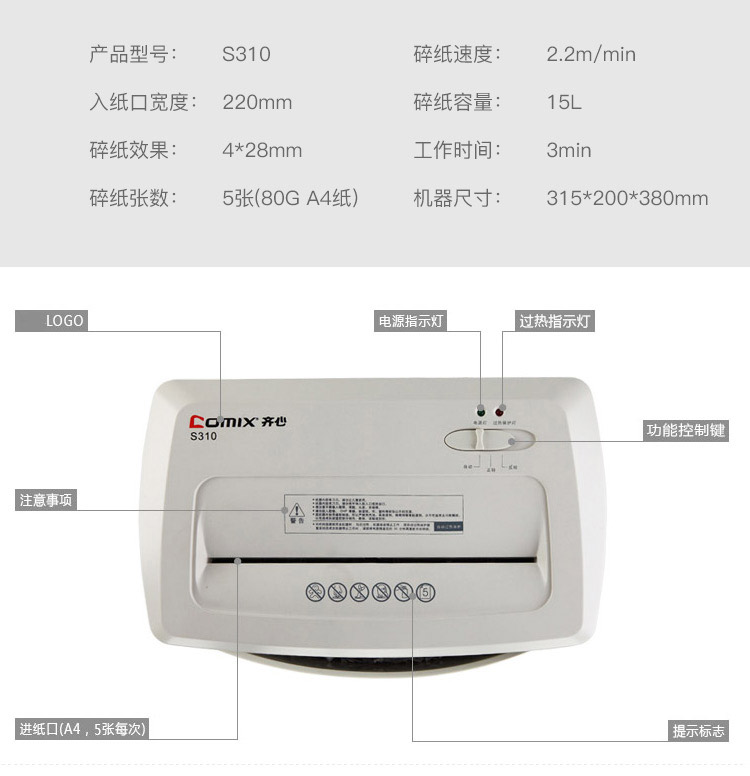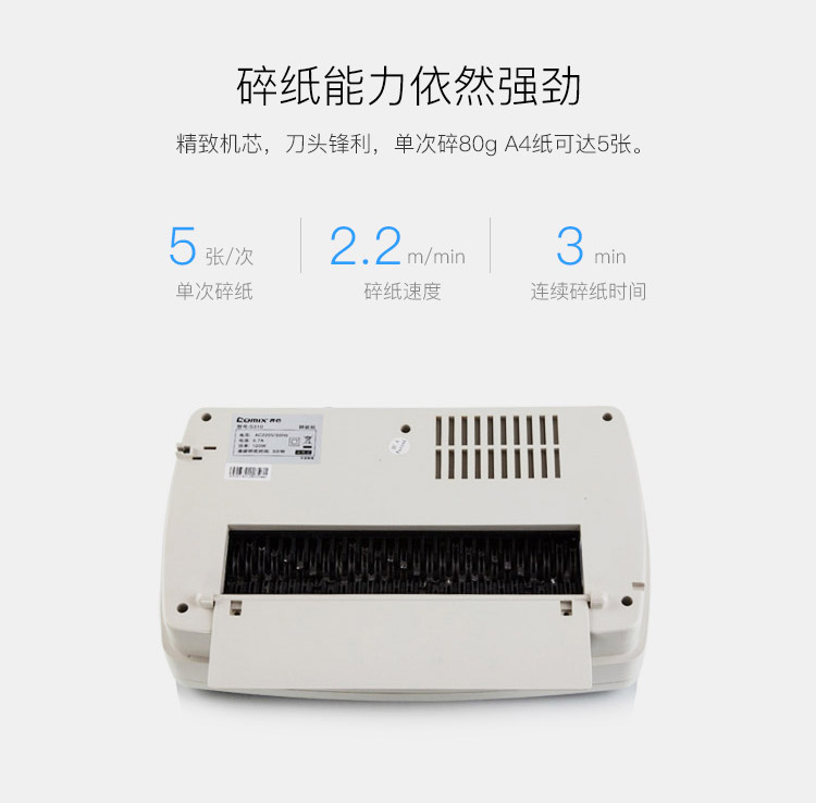 • 商品名称:齐心 COMIX S310 个人家庭碎纸机(5张纸一次 3级保密 续航3min)