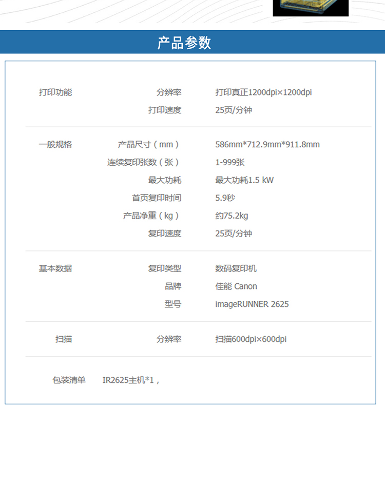 商品名称: 佳能 iR2635 A3黑白数码复合机多功能一体机 (主机+双面自动输稿器+双纸盒+工作台) 白色(单位:台)