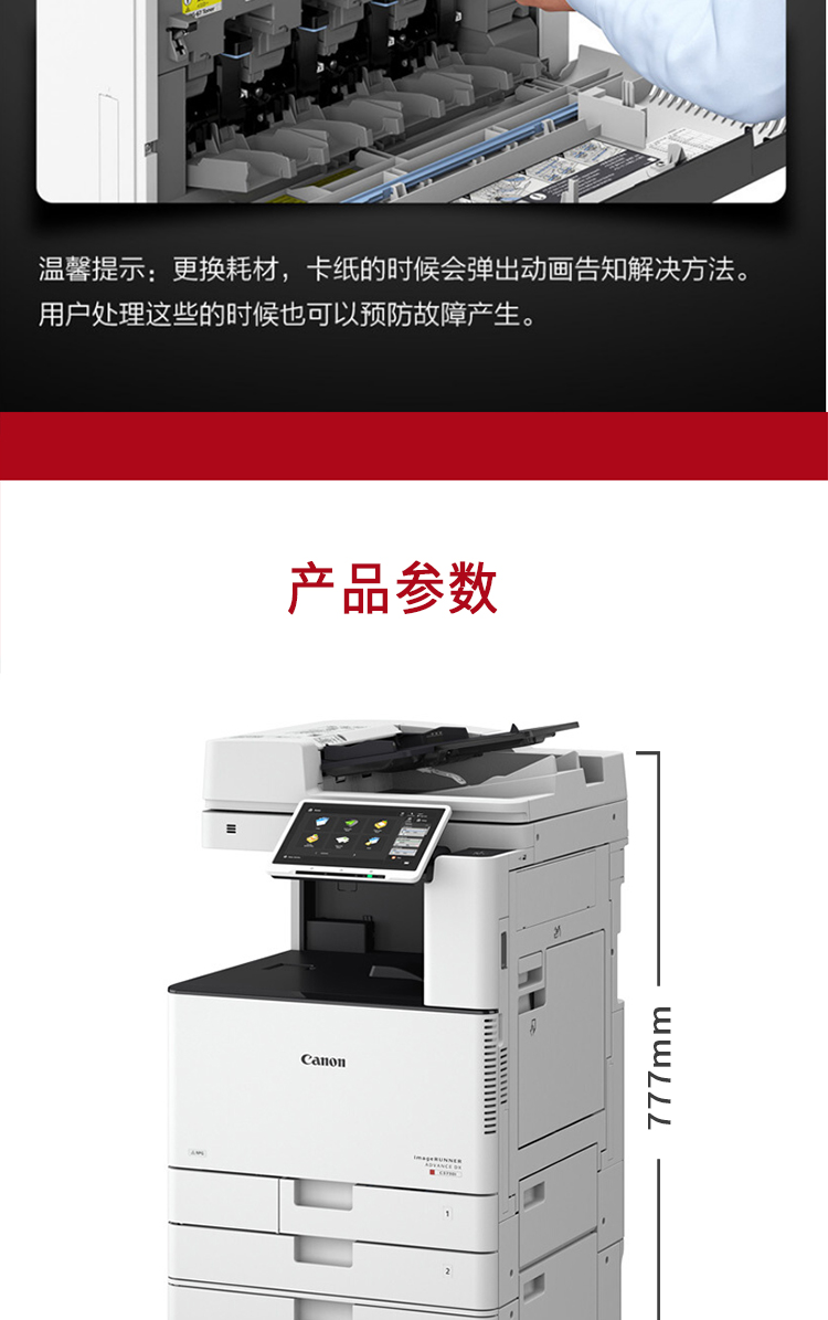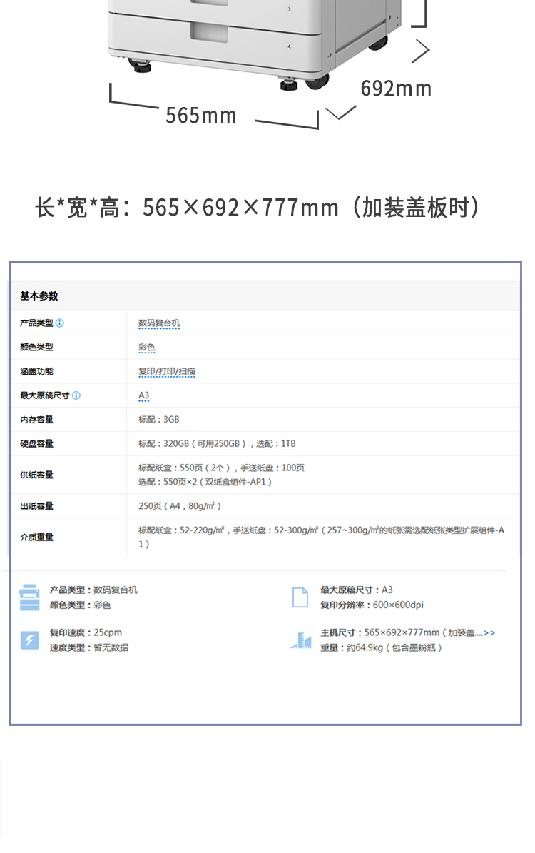 商品名称: 佳能 iRAC3725 A3彩色激光数码复合机多功能一体机 (主机+输稿器+四纸盒) 白色(单位:台)