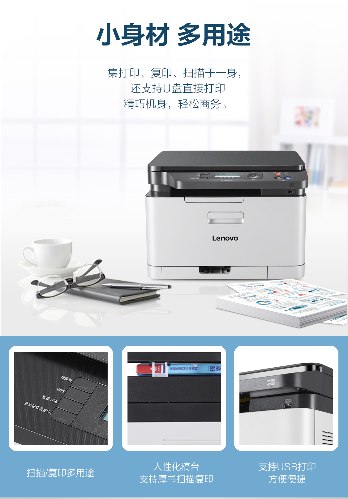 商品名称: 联想/lenovo 彩色激光三合一CM7120W(有线+无线) 彩色激光打印机 白色
