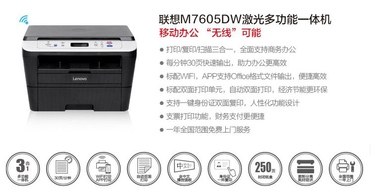 商品名称: 联想/lenovo M7605DW三合一(双面+无线) 黑白激光多功能一体机 黑色