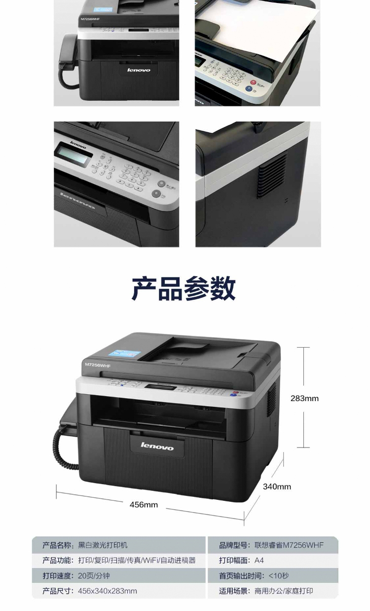 商品名称: 联想/lenovo 四合一M7256WHF(带手柄带无线) 黑白激光多功能一体机 黑色