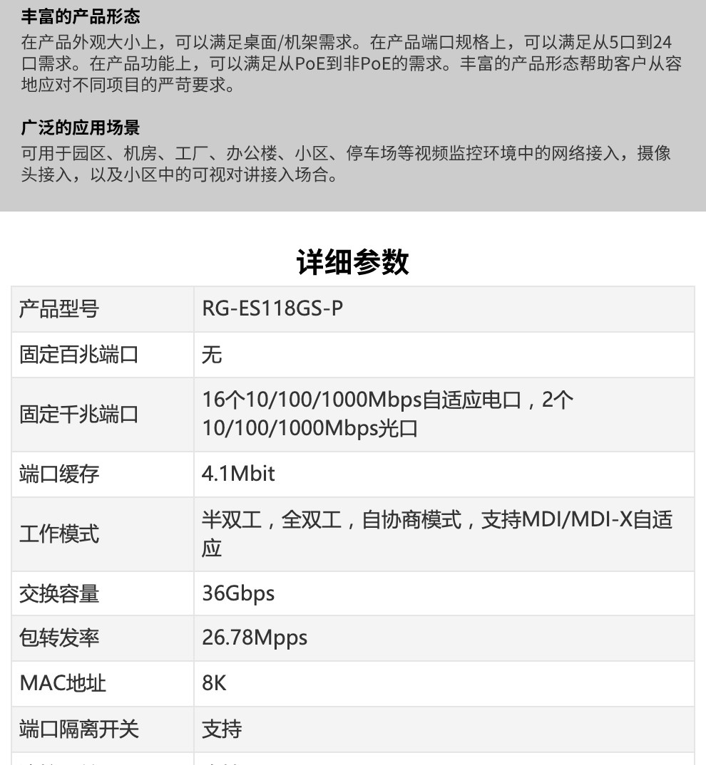 电脑外设  > 电脑整机  > 服务器  >  锐捷/Ruijie  >  锐捷(RUIJIE) )RG-ES118GS-P 16口 非网管交换机 监控安防专用交换机 (单位:台)