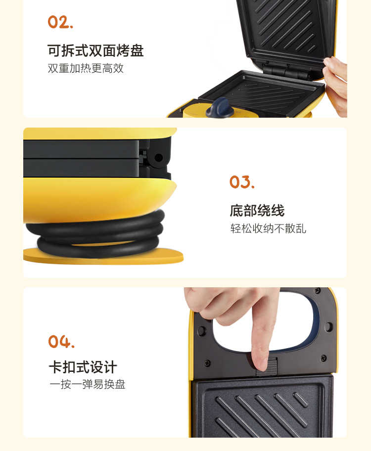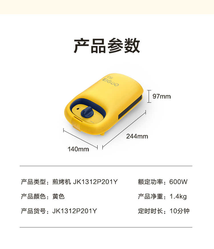 • 商品名称:美的 JK1312P201Y 14*24.4*9.7cm煎烤机 多功能双面煎烤早餐机 (线下同款)黄色 (单位:台)
