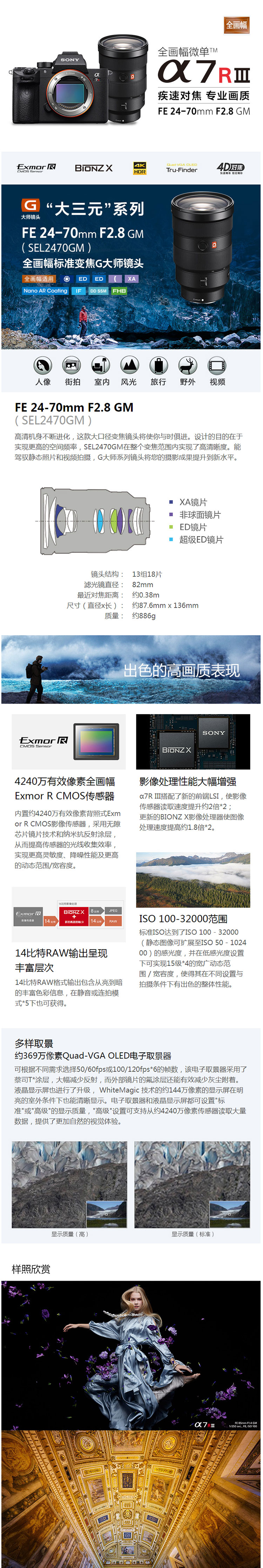 • 商品名称:索尼 ILCE-7RM3 全画幅微单套机(索尼GM大三元24-70mm镜头标准挂机套/思锐三脚架R2004/G20KX含云台)(单位:套)