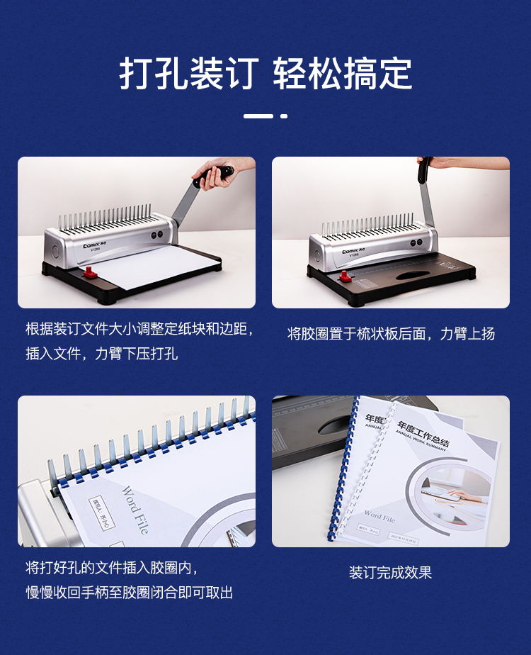 商品名称: 齐心 V1288 梳式财务凭证装订机省力胶圈打孔机/21孔 文本/招标书财务装机用品打孔(单位:台)