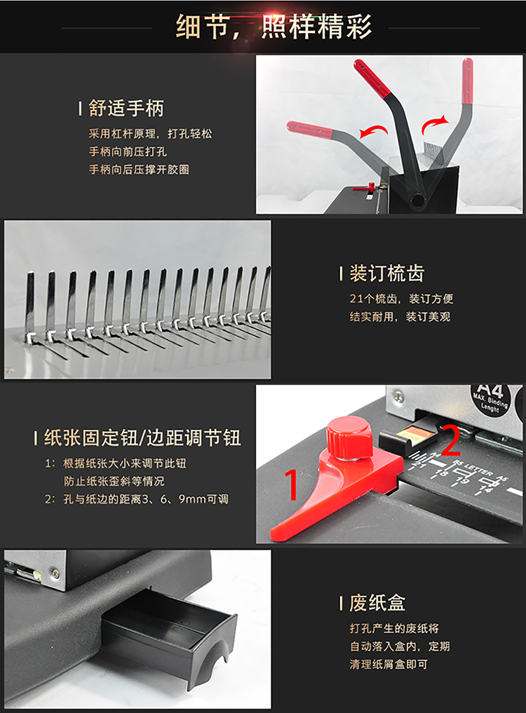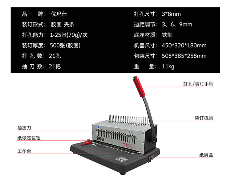 • 商品名称:优玛仕 (U-MACH) U-S87 21孔 装订厚度500页 手动 梳式装订机 胶圈装订机 (计价单位:台) 黑色