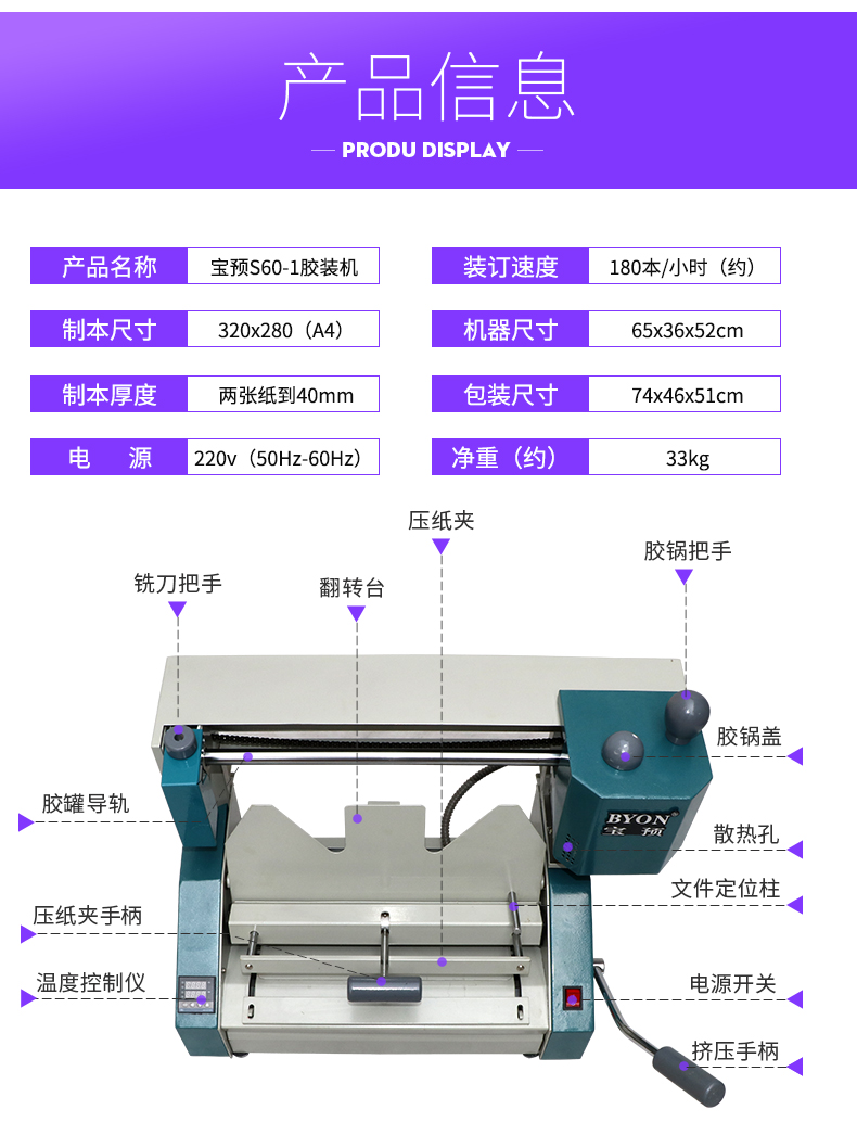 • 商品名称:宝预 S60-1 A4 全自动台式热熔胶胶装机标书装订机 白色(单位:个)