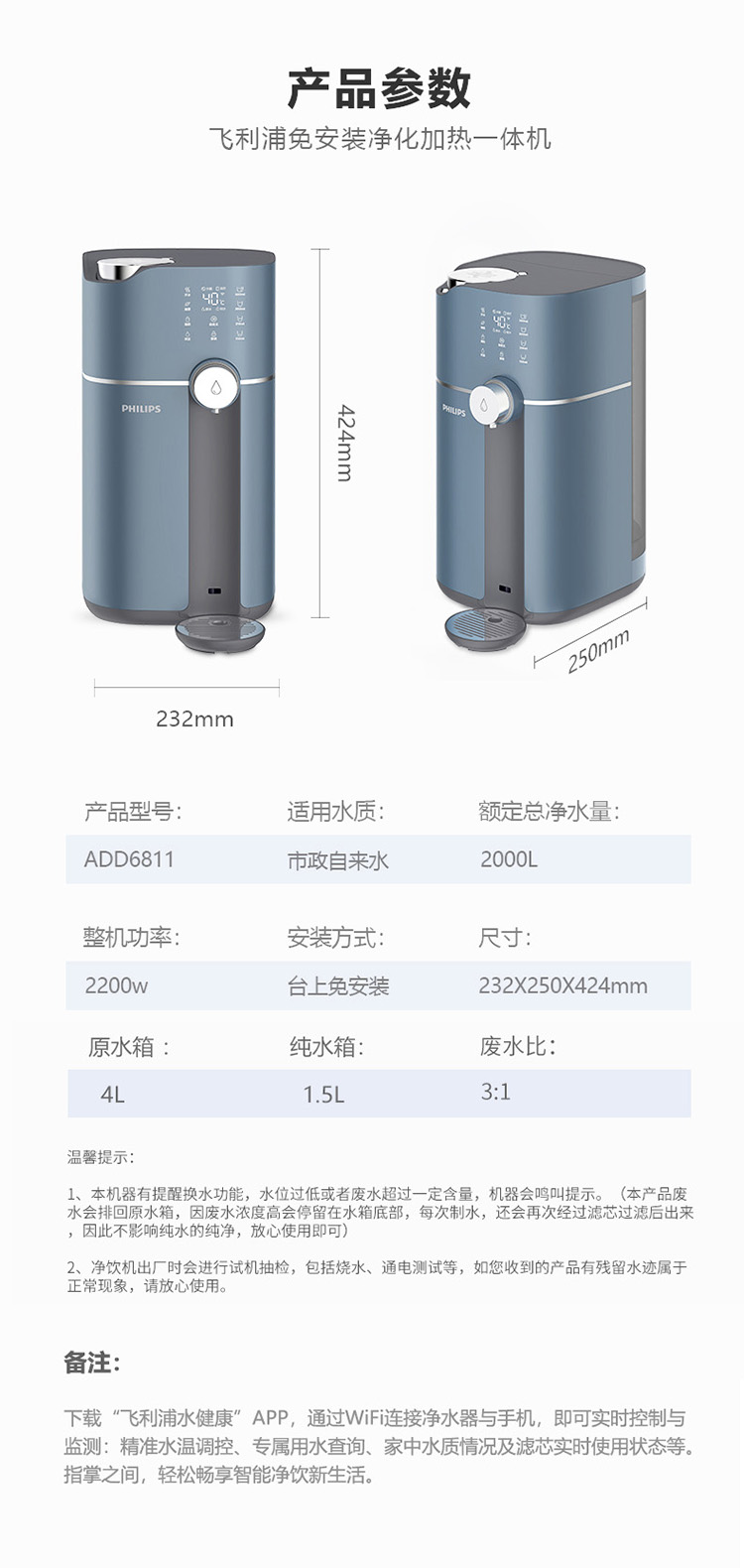 • 商品名称:飞利浦(PHILIPS)ADD6811 水魔方PD50S净饮一体机 直饮水机(单位:台)