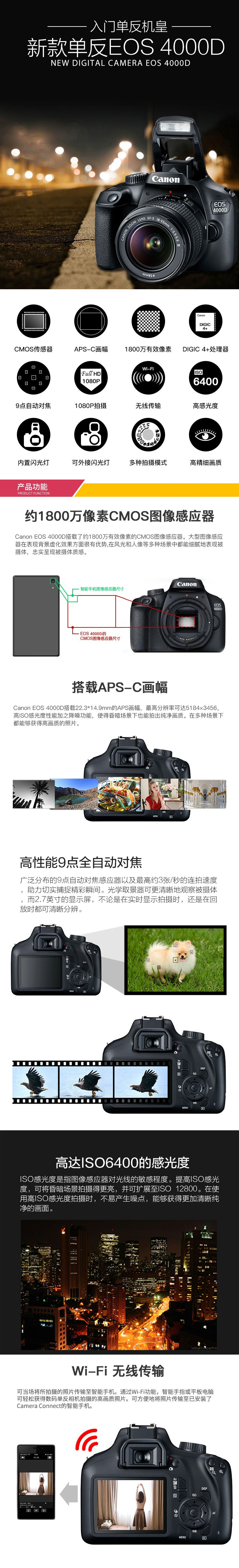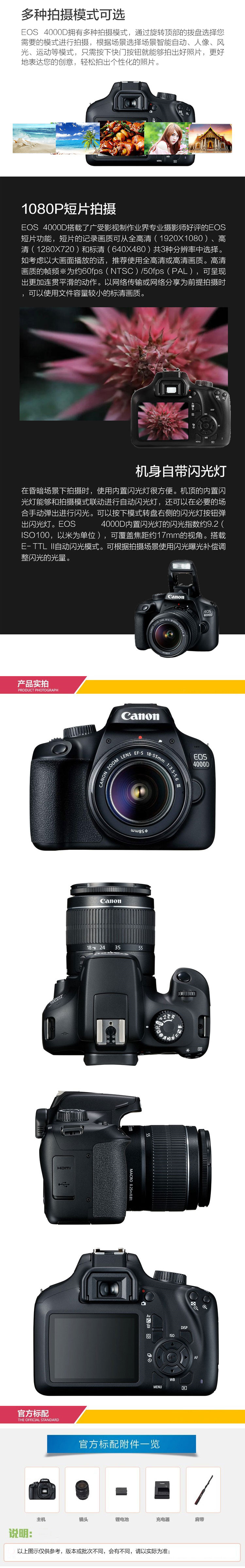 • 商品名称:佳能 EOS 4000D 单反数码相机+18-55mm III镜头 套机 APS-C画幅 入门单反机皇(单位:台)