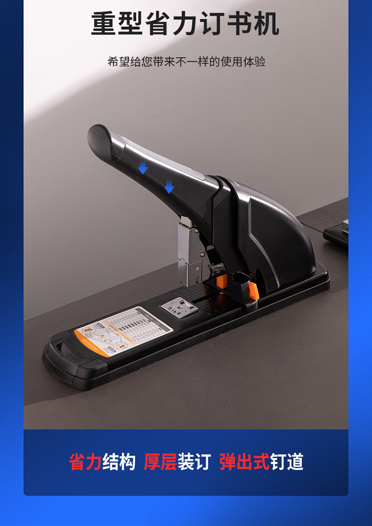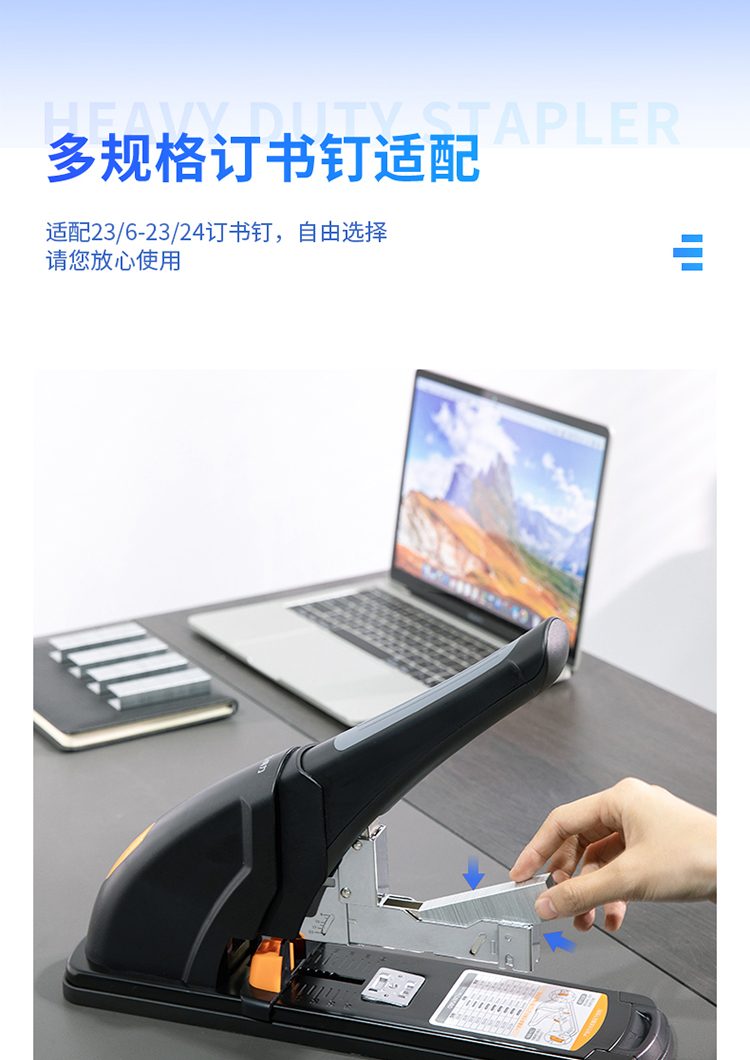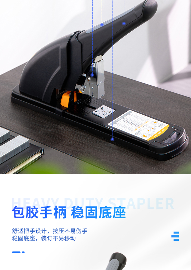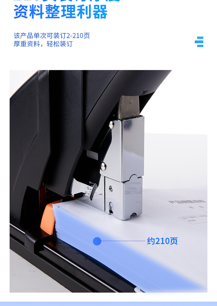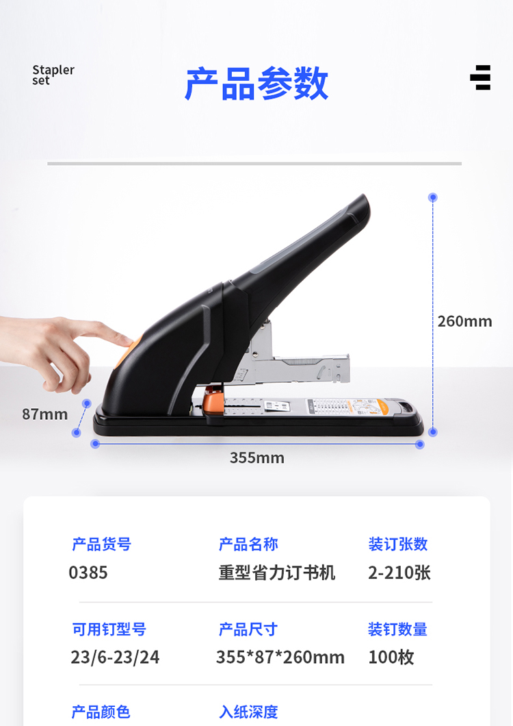 商品名称: 得力/deli 0385 订书机 210页省力重型 黑色
