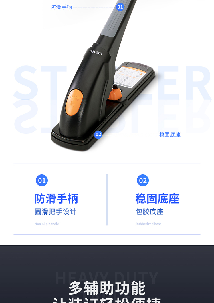 • 商品名称:得力/deli 0385 订书机 210页省力重型 黑色