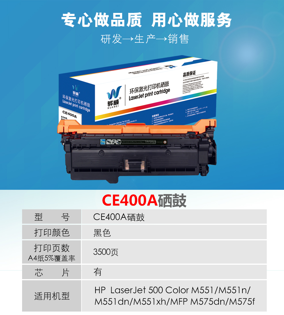 商品名称: 骅威 CE400A 硒鼓 适用惠普HP507A M551n M551dn M551xh MFP M575dn M575f M575C Canon LBP7780Cx 打印机 黑色 单位:个