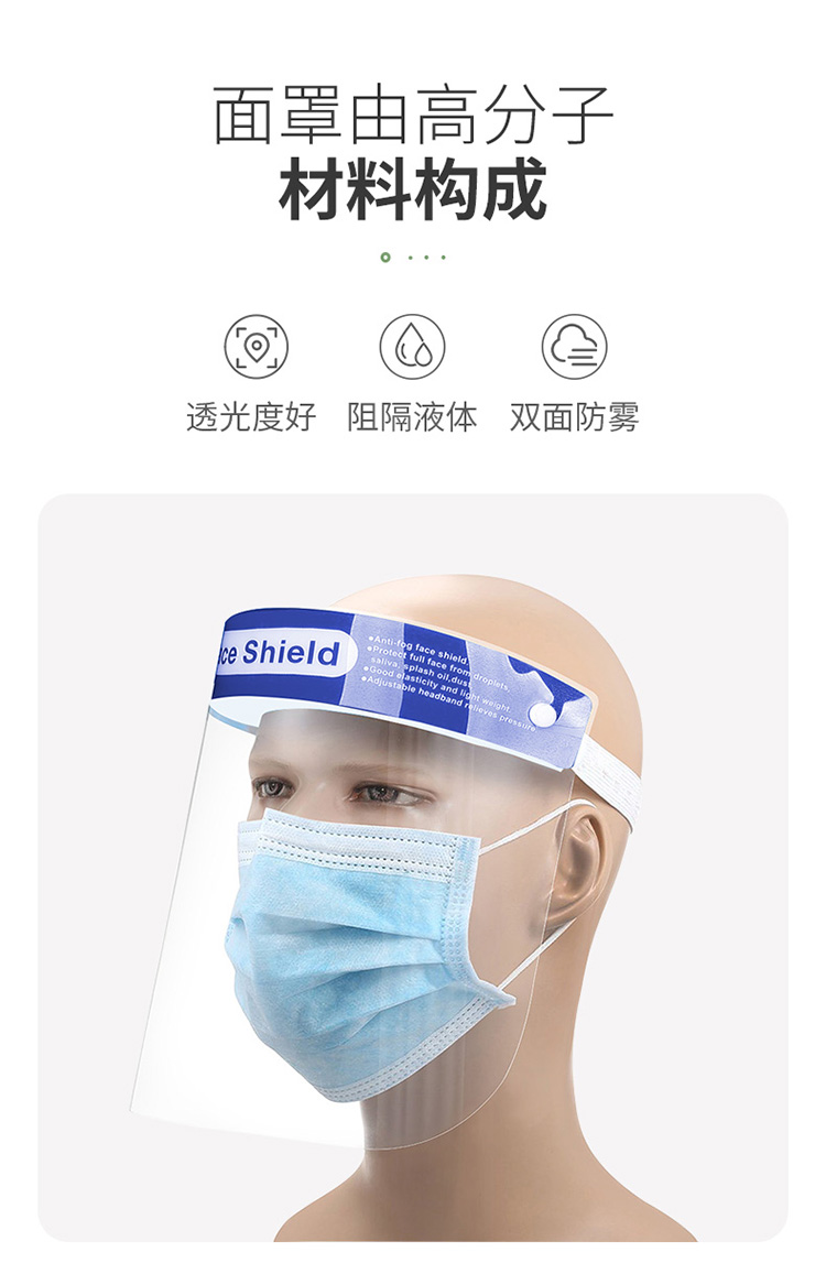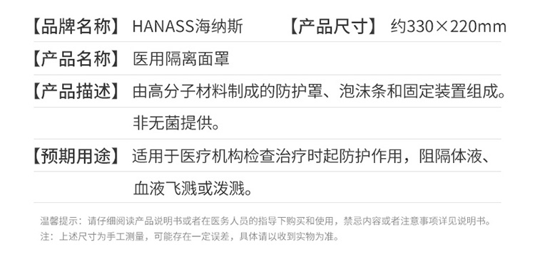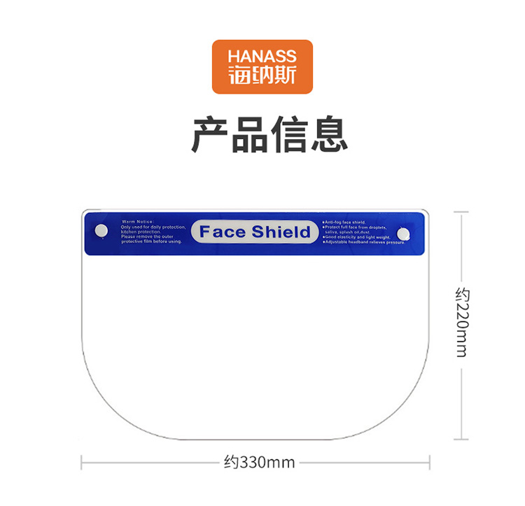 商品名称: HANASS 330*220mm 1个装 医用隔离面罩 防尘防飞沫防喷溅全脸防护 高清透光 大屏保护面罩头戴式(单位:个)