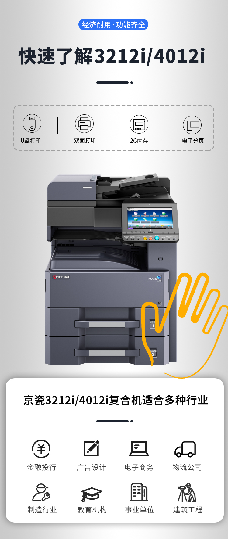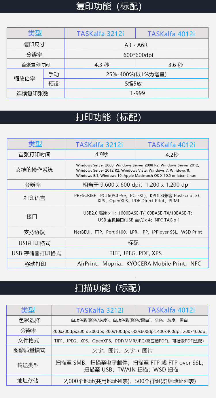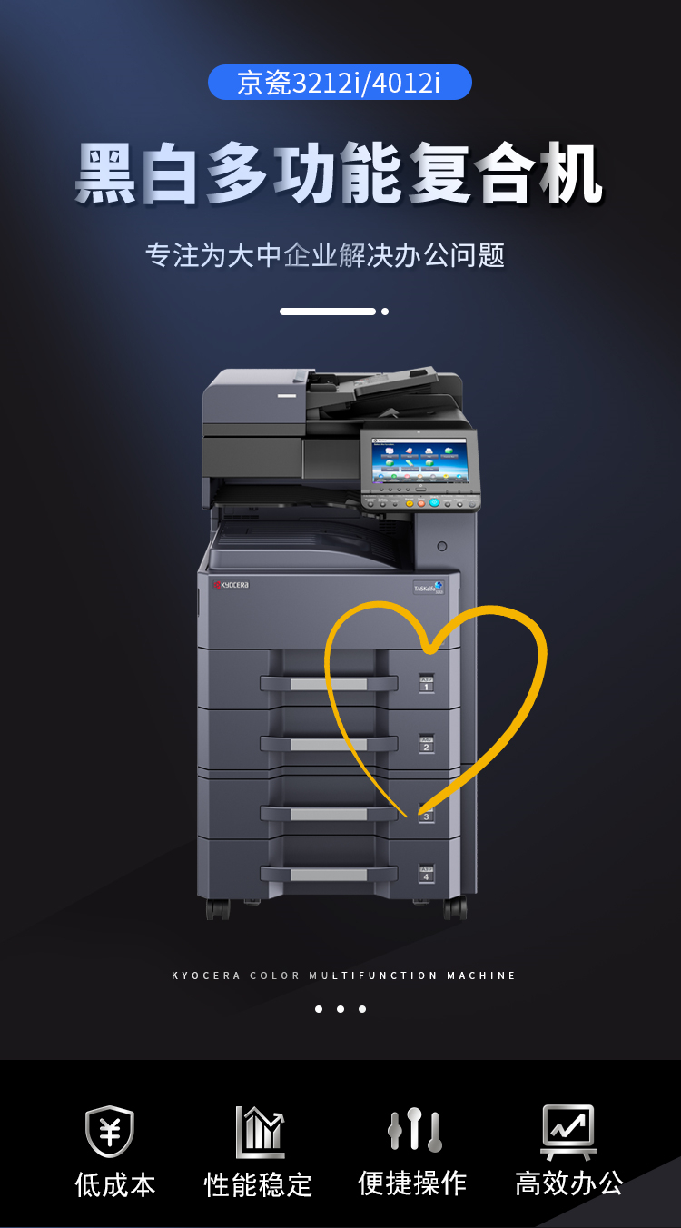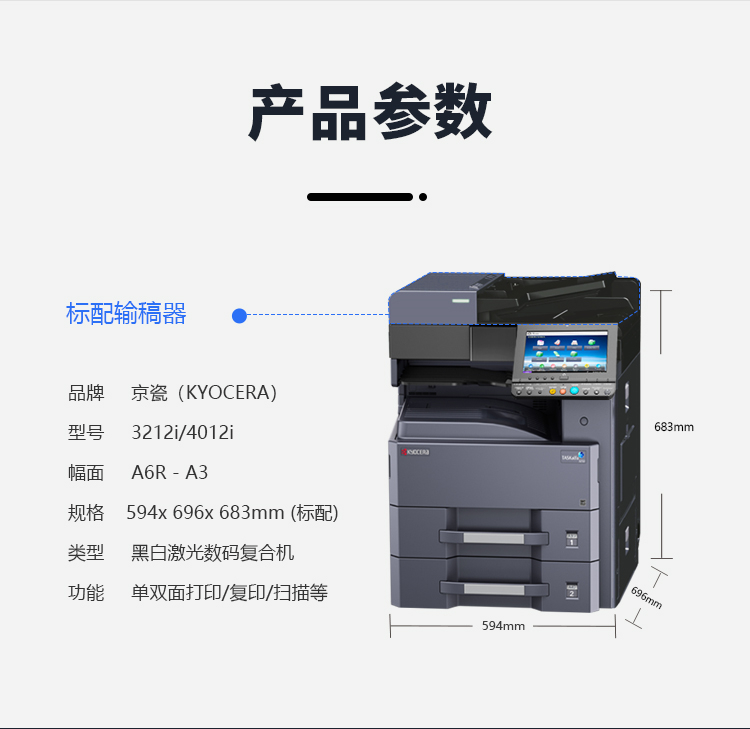 • 商品名称:京瓷 TASKalfa3212i a3黑白打印机一体机 输稿器+双面打印+网络 双层纸盒 (单位:台)