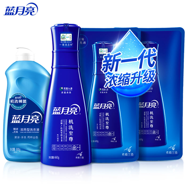 清洁洗护  > 衣物清洁  > 洗衣液/洗衣凝珠  >  蓝月亮/Bluemoon  >  蓝月亮机洗至尊(浓缩+)洗衣液 四件套(660g瓶+600g袋×2+500g机洗神器)(单位:套)