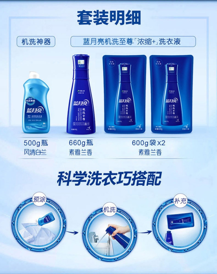 • 商品名称:蓝月亮机洗至尊(浓缩+)洗衣液 四件套(660g瓶+600g袋×2+500g机洗神器)(单位:套)