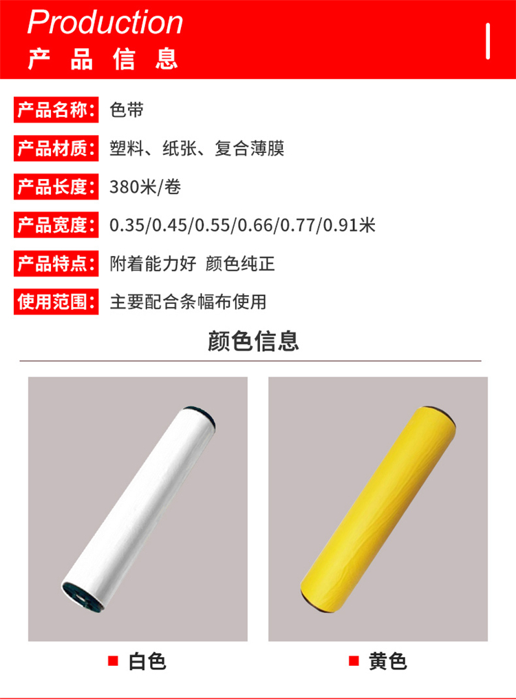 • 商品名称:国产 条幅机色带标语条幅布材料适用玉樵夫奥德利条幅机 宽度0.45米(380米/卷) 黄色(单位:卷)